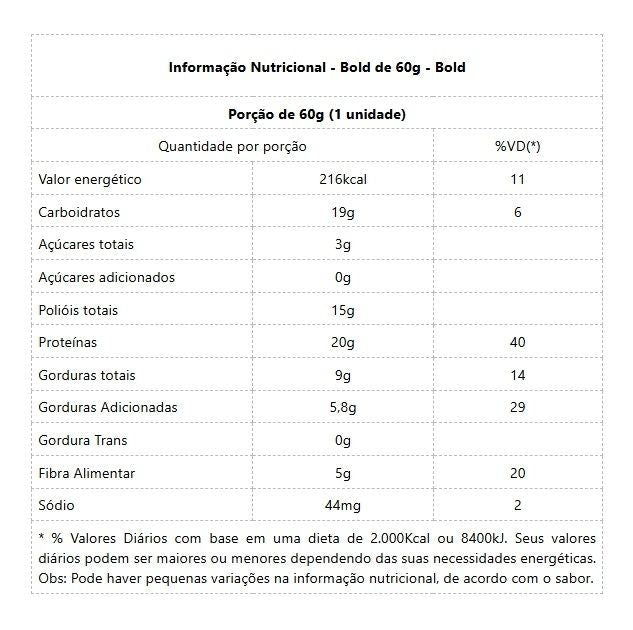 Bold Bar (60g)       A Bold oferece barrinhas de proteína com um sabor irresistível, ideais para pequenas refeições ao longo do dia e para auxiliar na regulação do apetite. Elas proporcionam níveis sustentados de energia, abastecem o corpo com nutrientes de alta qualidade e promovem o desenvolvimento muscular. Com 20g de proteína, a Bold é uma opção saudável e saborosa, com uma composição balanceada de fibras, gorduras e carboidratos.      Perfeita para todos os momentos vai muito bem como aquele lanche feito entre as principais refeições como pré e pós-treino ou, até mesmo como uma sobremesa extremamente saborosa e que não compromete a rotina alimentar. Experimente!   Benefícios: - 20g de proteínas;- Zero adição de açúcares;- 5g de Fibras;- Perfil equilibrado de gorduras e carboidratos;- Baixa quantidade de sódio;- Saborosa, prática e fácil de consumir.