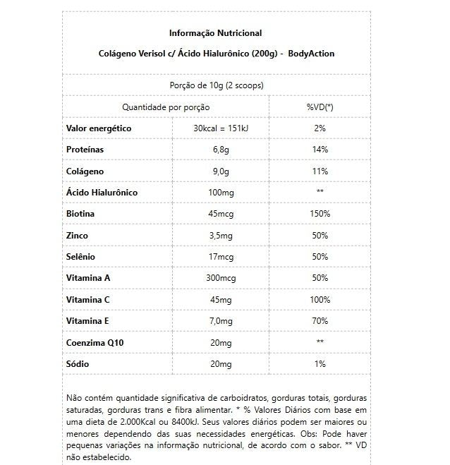 Colágeno Verisol c/ Ácido Hialurônico (200g) - Body Action O Colágeno Hidrolisado BodyAction é um suplemento à base de colágeno Verisol® e ácido hialurônico, duas substâncias altamente eficientes em manter a elasticidade e firmeza da pele, sendo importantes também para a saúde das unhas e cabelos. Para que serve Colágeno Hidrolisado com Ácido Hialurônico BodyAction? Quando usados ??em conjunto, o colágeno hidrolisado e o ácido hialurônico podem trazer benefícios complementares para a saúde da pele e articulações. O colágeno hidrolisado vai agir na melhoria da elasticidade da pele, ajudando a reduzir a aparência das rugas e linhas de expressão, além de apoiar a saúde das articulações (nesse caso com uma ação maior do colágeno tipo 2). Já o ácido hialurônico vai ajudar a hidratar a pele, melhorando a textura e o tônus, sendo importante também para a lubrificação e amortecimento das articulações. A Bodyaction adicionou em seu colágeno importantes vitaminas e minerais com ação direta na síntese de colágeno e na melhoria da qualidade da pele, unhas e cabelos, como é o caso da biotina, do silício e da vitamina C, por exemplo. Além disso, para manter um organismo e uma pele saudável é importante combater os radicais livres, sendo assim, não poderia faltar nenhum composto como vitaminas A, E, a coenzima Q10 e os minerais zinco e selênio. Benefícios: - 2,5g de Colágeno Verisol por porção;- 100mg de Ácido Hialurônico;- 45mg de Vitamina C;- 3mg de Silício;- Controle de linhas de expressão, rugas e flacidez;- Deixa unhas e cabelos mais fortes;- Contém Biotina, Vitaminas A, C, E, além de Zinco, Selênio e Coenzima Q10;- Livre de edulcorantes artificiais, o suplemento vem adoçado com Stévia, deixando o produto ainda mais saudável;- Possui várias opções de sabor: Laranja com Acerola, Abacaxi com Hortelã, Uva, Limão com Clorofila e claro, a opção natural (sem sabor).