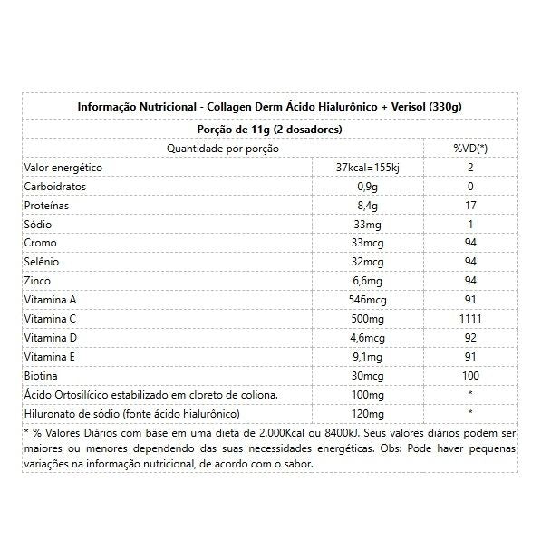 Collagen Derm Ácido Hialurônico + Verisol (330g) Collagen Derm - Nutrify é uma formulação completo, que reúne os ativos mais importantes e comprovadamente eficazes para a saúde da pele, unha e cabelos. Cada porção fornece 8,4 g de proteínas provenientes de colágeno hidrolisado, 120mg de ácido hialurônico, 100 mg de ácido ortosilícico estabilizado em colina e 2,5 g de Verisol, que auxiliam na recuperação da firmeza dos tecidos. Sua formulação conta ainda com as vitaminas A, C, D, E, melhorando sua aparência. Biotina e os minerais Zinco, Selênio e Cromo, que favorecem a absorção dos peptídeos de colágeno e promovem o fortalecimento de unhas e cabelo. Todos os ativos do Collagen Derm juntos são poderosos para a beleza; o ácido ortosilícico é encarregado pelo aumento da síntese das "proteínas da beleza”, como o colágeno, elastina e queratina, a biotina é uma vitamina fundamental para a produção de queratina, e os minerais e vitaminas para complementar a fórmula, ajudando assim na prevenção contra os radicais livres e melhora de absorção de colágeno na pele. Benefícios: - 120 mg de Ácido Hialurônico Haplex Plus;- 100 mg de Ácido Ortosilícico;- 2.5 g de Verisol;- 9 g de Peptídeos de Colágeno Hidrolisado;- 30 mcg de Biotina;- Pele mais hidratada e com menos rugas;- Melhora a saúde da pele, cabelos e unhas.