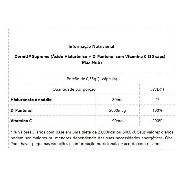 DermUP Supreme - Ácido Hialurônico + D-Pantenol com Vitamina C (30 caps) O DermUp Supreme da Maxinutri em cápsulas possui formulação exclusiva com D-Pantenol, ácido hialurônico e vitamina C. O ácido hialurônico é um componente naturalmente presente em nossa pele. Sua formulação aliada a vitamina C estimula a alta produção de Colágeno na camada mais profunda da pele, aumentando a hidratação e reduzindo o aparecimento de rugas. DermUp contribui também para aumento da elasticidade da pele e reduz o aspecto da celulite. Além de ser um potente antioxidante, atua agindo de dentro para fora, inibe a ação dos radicais livres, estimula o metabolismo da pele retarda os sinais de envelhecimento. Benefícios:* Pele mais bonita;* Reduz rugas e linhas de expressão;* Maior elasticidade a pele;* Reduz a celulite;* Estimula a produção de colágeno.