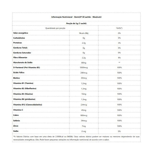 DermUP Supreme Verisol (Peptídeos de Colágeno + Ácido Hialurônico (30 Sachês de 5g) Ambos os processos intrínsecos e extrínsecos de envelhecimento estão associados a alterações fenotípicas em células aparentes, bem como alterações estruturais e funcionais na matriz extracelular dérmica (MEC). Os fibroblastos dérmicos são as células responsáveis ??pela síntese das proteínas do MEC, como colágeno, fibras elásticas e proteoglicanas que conferem resistência, resiliência e hidratação, respectivamente. Estas proteínas são fundamentais para manutenção da estrutura e função da pele. As principais modificações do MEC durante o envelhecimento, destacando-se as alterações de colágeno, têm sido sugeridas como causa das alterações clínicas observadas no processo de envelhecimento. BENEFÍCIOS DERMUP SUPREME: - Pele mais bonita; - Reduz rugas e linhas de expressão; - Maior elasticidade a pele; - Reduz a celulite;