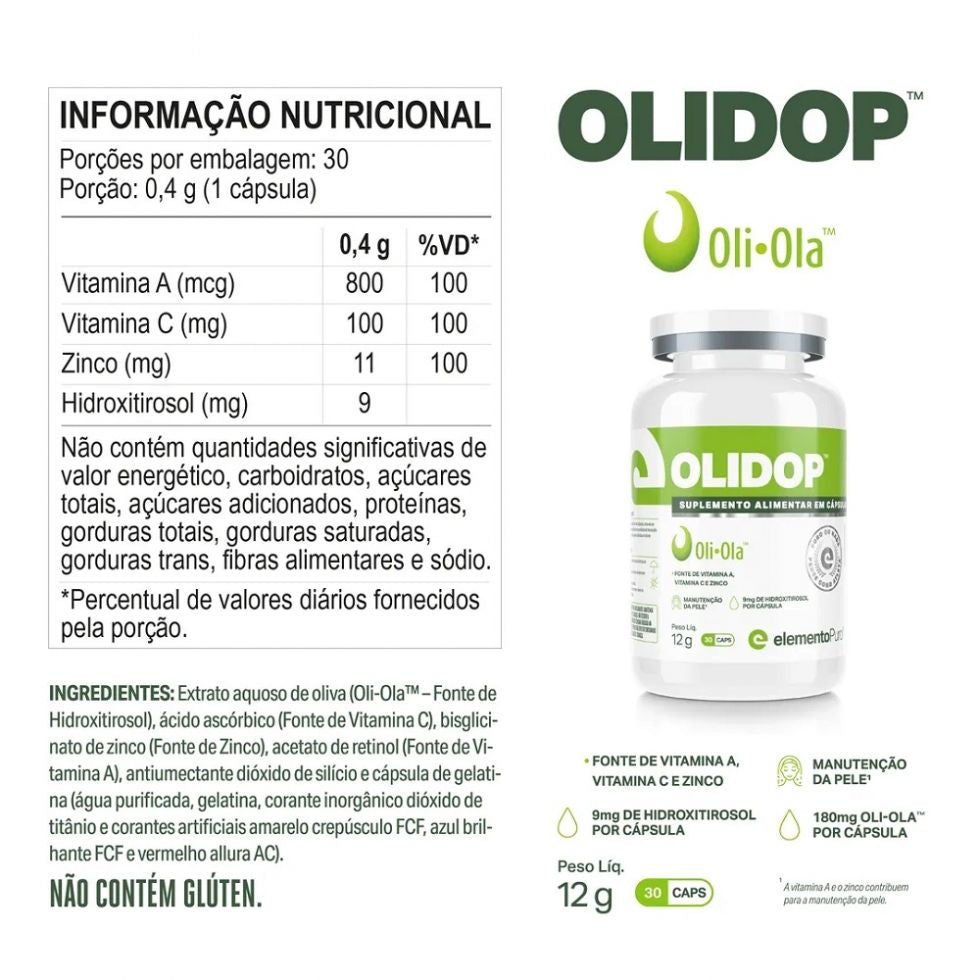 OliDop Oli-Ola (30 caps) Deixe aflorar o melhor da sua pele OLIDOP é um suplemento alimentar desenvolvido a partir do extrato natural do fruto da oliveira. Possui vitamina A e C, zinco e é padronizado em 5% de hidroxitirosol, componentes que contribuem para a saúde e o aspecto da pele. Uma excelente adição à rotina de skincare! Feito com Oli-Ola (original) Formulado com o autêntico Oli-Ola, de alta qualidade e eficácia. Devido à sua pureza, esse ativo tem excelente síntese e melhor aproveitamento pelo organismo. Proporciona à pele o efeito "peeling em cápsulas”, pois renova os tecidos de dentro para fora, ajudando na manutenção da beleza. Benefícios: - Os efeitos de OLIDOP são resultado da presença de Oli-Ola, Vitamina A, Vitamina C e Zinco na composição do produto;- Ajuda na manutenção geral da aparência da pele;- Uniformiza o tom da pele, clareando manchas de Melasma e acne;- Melhora a maciez, textura, firmeza e elasticidade da pele;- Preserva o colágeno e a elastina;- Promove a renovação celular e reduz a inflamação cutânea;- Reduz os radicais livres que causam estresse oxidativo na pele;- Protege a pele da radiação ultravioleta;- Ideal para todo tipo de pele.