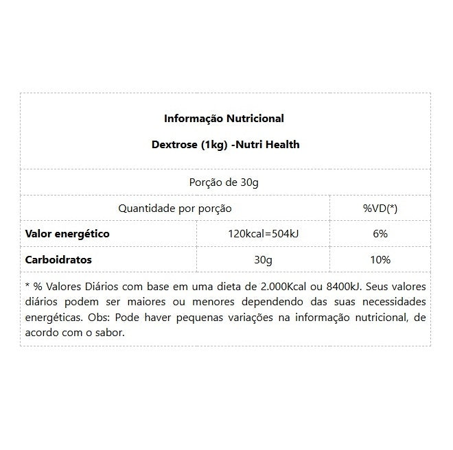 Dextrose (1kg) -Nutri Health A dextrose é um carboidrato simples que é rapidamente absorvido pelo organismo. Mantém os níveis de carboidratos desejados no organismo, impedindo a degradação da proteína do músculo, além de ser um potente retardador da fadiga muscular. Ele contribui para o ganho de massa muscular em pessoas que praticam musculação e é um fonte de energia para quem faz atividades aeróbicas.Benefícios:* Auxilio no ganho de massa muscular* Fornece energia durante treinos longos* Pode ser usada como fonte de nutrição* Otimiza o desempenho físico* Auxilia no processo de recuperação