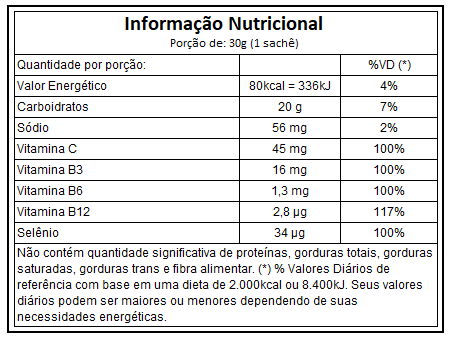 Endurance Energy Gel (30g) Endurance Energy Gel é um gel de carboidrato de rápida absorção que promove energia imediata e de longa duração. Durante a prática esportiva, irá contribuir para um equilíbrio entre carboidratos, além de possuir os principais minerais para uma reposição eletrolítica, aumentando a energia e promovendo uma hidratação mais eficiente, vitaminas e antioxidantes que minimizam os danos causados pelos radicais livres. Pronto para consumo em sachês de 30g, o Endurance Energy Gel é à base de carboidratos, vitaminas e minerais. Cada unidade possui 80kcal, 20g de carboidratos, 56mg de sódio, 45mg de Vitamina C, Vitaminas do Complexo B e Selênio. Benefícios:- A vitamina C e o selênio são antioxidantes que auxiliam na proteção dos danos causados pelos radicais livres;- A vitamina C, vitamina B6, vitamina B12 e o selênio auxiliam no funcionamento do sistema imune;- A niacina (vitamina B3), a vitamina B6, vitamina B12 e a vitamina C auxiliam no metabolismo energético;- A niacina (vitamina B3), a vitamina B6 e a vitamina B12 auxiliam no metabolismo de proteínas, carboidratos e gorduras e a vitamina C auxilia no metabolismo de proteínas e gorduras;- A vitamina B6 e a vitamina B12 auxiliam na formação das células vermelhas do sangue;- A vitamina B6 e a vitamina B12 auxiliam no metabolismo de homocisteína;- A vitamina C auxilia na formação do colágeno, na absorção de ferro dos alimentos e na regeneração da forma reduzida da vitamina E;- A vitamina B6 auxilia no metabolismo de proteínas e do glicogênio e na síntese de cisteína;- A vitamina B12 auxilia no processo de divisão celular;- A niacina (vitamina B3) contribui para a manutenção da pele e auxilia na manutenção de mucosas.