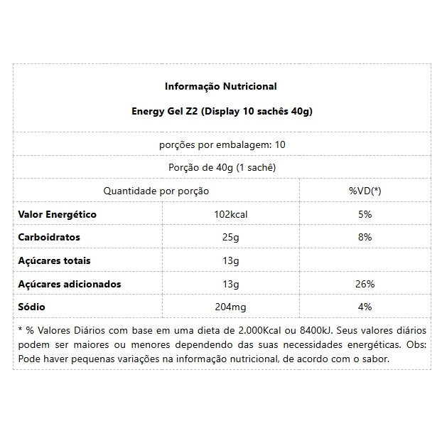 Energy Gel Z2 (Display 10 sachês 40g) Fala meu atleta! Acreditamos que o ser humano não tem limites, e que o limite é exclusivamente imposto por ele mesmo. Através dos nossos produtos fazemos com que você se aproxime cada dia mais desse potencial infinito. Nossos géis tem as características ideais para atingir a alta performance. Consistência mais líquida, facilitando a ingestão durante esforços de alta intensidade, todos com o mesmo blend exclusivo de carboidratos, mas com diferentes composições para personalizar sua nutrição nos treinos e provas além de um sabor incomparável. Bons Treinos! Benefícios: - 25g de carboidratos;- Liberação perfeita ao longo da atividade física;- Energia no curto, médio e longo prazo do exercício;- Sabores irresistíveis.