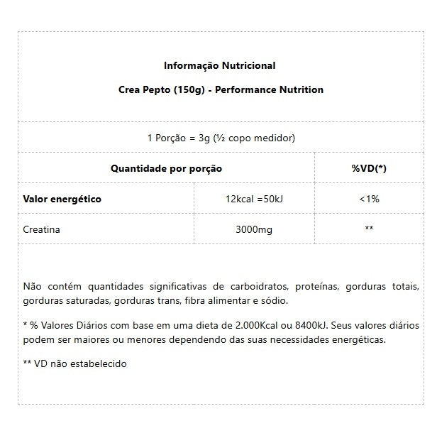 CREA PEPTO (150g) - PERFORMANCE NUTRITION CREA PEPTO fornece 3g de Creatina Monoidratada por porção: Esta é a dosagem recomendada por dia pela ANVISA (Agência Nacional de Vigilância Sanitária). Creatina é um produto destinado a complementar os estoques endógenos de creatina. BENEFICIOS:* Fornece 3g de Creatina Monoidratada por porção;* Instantânea e pura;* Aumento da força muscular;* Impulsiona níveis de força;* Aumento da massa muscular;* Aumento do desempenho físico.