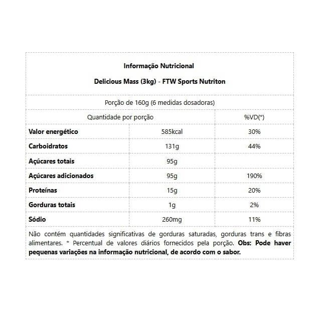 Delicious Mass (1,4kg) - FTW Sports Nutriton O Delicious Mass FTW apresenta variedade e praticidade em um só produto, além de ser um suplemento alimentar hipercalórico rico em proteínas e carboidratos, ele também conta com a adição de Waxy Maize Glutamina. Auxiliando no ganho de massa muscular e peso saudável, além de ser uma excelente opção para aqueles que necessitam ganhar peso mas tem dificuldades por conta do metabolismo acelerado. Benefícios: * Aumenta o ganho de massa muscular;* Acelera o ganho de volume corporal;* Melhora a capacidade de ingestão calórica da dieta;* Efetiva o ganho de peso.