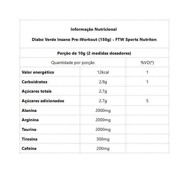 Diabo Verde Insano Pre-Workout (150g) - FTW Sports Nutriton --* SEU TREINO MUITO MAIS INSANO Deixe seu treino insano com um poderoso pré-workout com 200mg de cafeína. Em sua composição encontramos aminoácidos não essenciais como a alanina, a arginina e a taurina. Além de sua base, duas substâncias potentes: a cafeína, que auxilia no aumento da performance no desempenho de exercícios físicos de resistência, e a creatina que auxilia no aumento do desempenho físico durante exercícios repetidos de curta duração e alta intensidade. Compre com garantia de qualidade direto da fábrica. O que é o Diabo Verde Insano FTW? Cada substância escolhida para o Diabo Verde Insano FTW, foi pensada exclusivamente para o melhor desempenho das vias metabólicas do nosso organismo. Diabo Verde Insano FTW é a combinação perfeita para o seu treino! Como tomar o Diabo Verde Insano FTW? A melhor maneira de como consumir o Diabo Verde Insano FTW dependerá de cada caso. Por isso, é necessário consultar um profissional da saúde para acrescentar esse produto em sua rotina. Dessa forma irá depender da demanda do organismo de cada um. De qualquer forma em nossa embalagem recomendamos diluir 10g (2 medidas dosadoras) em 1 copo contendo 200ml de água gelada ou suco de preferência. BENEFÍCIOS:* Força e Disposição para treinos mais duradouros;* Maior vasodilatação dos vasos sanguíneos; * Acelera o crescimento muscular;* Aumento prolongado da energia;