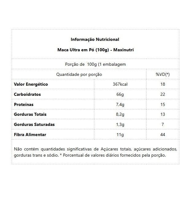 Maca Ultra em Pó (100g) A Maca Peruana é uma raiz conhecida milenarmente por seu caráter potencializador, além de contribuir para maior disposição diária. E o suplemento em pó da Maca Ultra Maxinutri possui alta concentração. Ela contribui na melhor nutrição da região pélvica, além de equalizar níveis de hormônios de forma natural. Concluindo, a Maca Peruana também é um energético natural, já que ajuda em equalizar vários hormônios no corpo, otimizando o metabolismo, algo muito interessante visto ao cotidiano desgastante. Benefícios:* Minimiza os sintomas da menopauza;* Possui propriedades estimulantes;* Regula os hormônios femininos de forma natural;* Auxilia na aceleração do metabolismo;* Contribui para uma maior disposição.