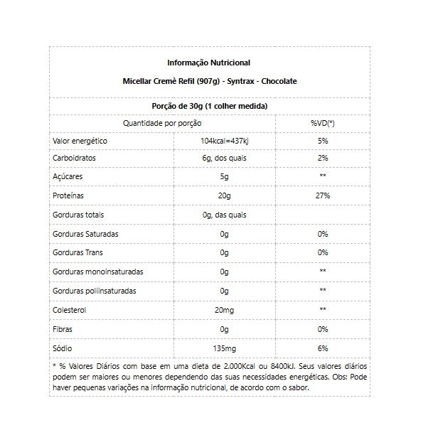 Micellar Crème Refil (907g) Micellar Creme é o modelo de excelência para um produto de caseína. É composto por Caseína Micelar pura e fresca, não contaminada com sais de caseinato inferiores. Micelar Creme da Syntrax garante uma bebida cremosa, paladar suave e saboroso, como um verdadeiro milkshake deve ser. Principal ingrediente naturalmente presente no leite, a caseína é uma das proteínas de mais alta qualidade conhecidas pelo homem. Caseína nativa, também conhecida como a Caseína Micelar, é um produto especial, produzido através de um método de filtração suave, na ausência de calor e de substâncias químicas cáusticas. É facilmente diferenciada de sua versão desnaturada por possuir sabor superior, maior cremosidade e capacidade para dispersar de forma mais instantânea. Além disso, a Caseína Micelar possui qualidade superior por otimizar a recuperação muscular e auxiliar nas ações contra o catabolismo. Benefícios: - 100% Caseína Micelar;- Proteína de Lenta Absorção;- Mistura instantaneamente;- Gera mais saciedade;- Reduz o catabolismo; - Zero Gordura;- Livre de aspartame;- Ideal para ceia noturna;- Ótimo Sabor.