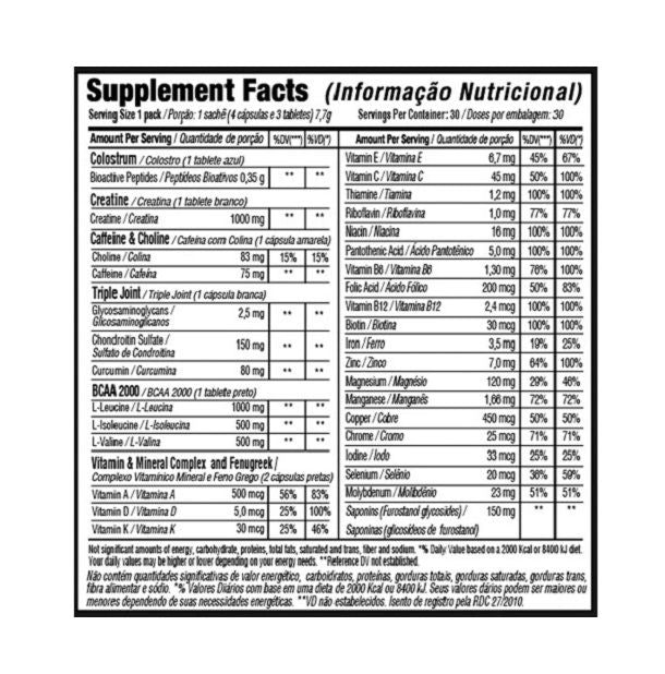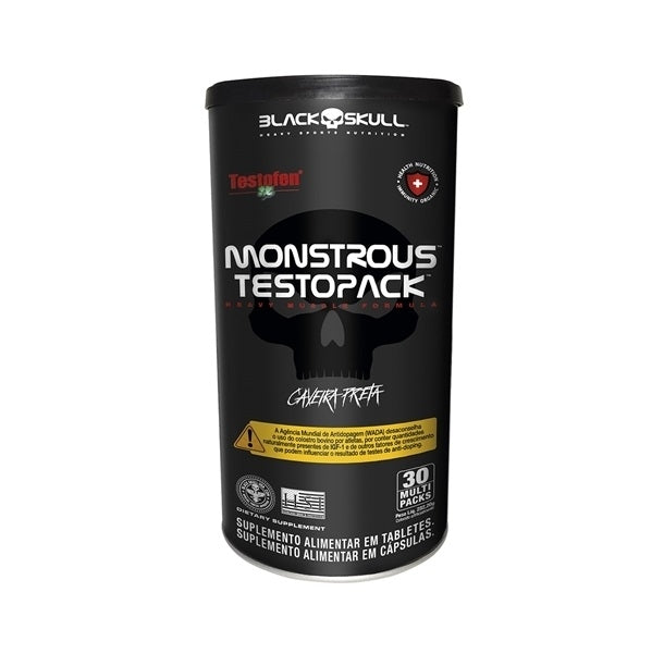 Monstrous TestoPack (30 packs) - Black Skull O MONSTROUS TESTOPACK ™ é mais um lançamento inovador da BLACKSKULL USA™. O pack reúne em sua formulação os principais ativos que favorecem os praticantes de musculação e/ou atividades de alta intensidade garantindo que tudo o que o corpo necessita será consumido, promovendo a manutenção e ganho da massa magra (hipertrofia). Como destaque de seus ingredientes temos o TESTOFEN™ poderosa fonte de saponinas as quais possuem a capacidade de estimular a produção endógena de testosterona, hormônio relacionado com a hipertrofia muscular. Outro ativo inovador presente em sua formulação é o colostro bovino que possui em sua composição fatores de crescimento como o IGF1, favorecendo a proliferação e a restituição celular, bem como a síntese de proteínas e o reparo de tecidos moles. Não menos importante, dentre as cápsulas do pack de suplementos encontramos ativos que irão auxiliar na prevenção de lesões articulares e ósseas bem como na redução de dores articulares existentes como o MSM, Sulfato de Condroitina, Magnésio e a curcumina. Além de todos os ativos citados acima o pack ainda fornece Creatina, BCAA’s, termogênicos e vitaminas e minerais. Benefícios: - Aumento significativo da massa magra muscular;- Síntese proteica aumentada;- Maior recuperação muscular após os treinos;- Eficaz no aumento da secreção de GH;- Desenvolve o músculo e a força;- Aumento dos níveis de testosterona;- Reduz o risco de lesão muscular;- Aumenta a performance muscular.