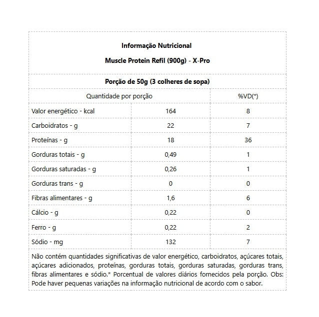 Muscle Protein Refil (900g) Muscle Whey Protein é a escolha perfeita para atletas que buscam um suporte completo em proteínas. Com um perfil de aminoácidos excepcional, este suplemento hiperproteico não apenas potencializa a recuperação muscular, mas também promove o ganho de massa magra, evita o catabolismo e fortalece o sistema imunológico. Com sua formulação de alta qualidade, o Muscle Whey é ideal para otimizar seu desempenho e alcançar seus objetivos de forma eficaz. Experimente e sinta a diferença nos treinos! Benefícios: - Ganho de massa muscular: com 18g de proteínas por dose, de alto valor biológico e rápida absorção, seus músculos terão o suporte ideal para o crescimento e desenvolvimento;- Recuperação muscular otimizada: diga adeus às dores e fadiga pós-treino! O Muscle Whey fornece os nutrientes essenciais para uma recuperação rápida e eficiente, te deixando pronto para o próximo desafio;- Ossos fortes e saudáveis: rico em Cálcio, o Muscle Whey garante a saúde e funcionalidade dos seus ossos;- Energia para o dia todo: além de proteínas, o Muscle Whey oferece uma dose extra de energia para você enfrentar seus treinos com ainda mais disposição e vitalidade.
