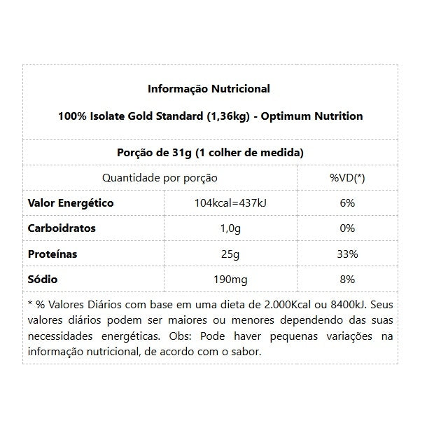 GOLD STANDARD 100% ISOLATE - OPTIMUN NUTRITION  A ÚNICA PROTEÍNA ISOLADA DE 100% DE WHEY QUE TRABALHA TÃO DURO COMO VOCÊ.     Para criar o OURO PADRÃO 100% ISOLADO, em sua composição foi seleciono apenas a proteína de soro de leite da mais alta qualidade, que passa por uma série de sofisticados processos de filtração para "isolar" o excesso de gordura, colesterol e açúcar. Uma parte deste Isolado de Proteína "Whey" é então hidrolisada - dividida em cadeias menores de aminoácidos - para facilitar a digestão.     O produto final é uma proteína completa de digestão rápida contendo no máximo 1 grama de carboidratos, menos de 1 grama de gordura e mais de 80% de proteína pura por porção. Colocamos o trabalho duro para garantir a super qualidade, para que você possa se concentrar em atingir metas de desempenho ambiciosas. ULTRA PURE PARA ULTRA RESULTADOS!!      Obtenha resultados máximos com ingredientes mínimos. Usando uma série de sofisticados processos de separação, o excesso de gordura, colesterol, açúcares e outros materiais são removidos, de modo que restam apenas 0 gramas de gordura total e 1 grama de carboidratos. O resultado é um delicioso isolado de proteína de soro hidrolisado ultra-puro, concebido para entrar rapidamente no seu corpo, para que os seus músculos possam ser reconstruídos. Benefícios: * Isolado de Proteína Whey Hidrolisada e Ultrafiltrada;* 1 grama de carboidratos por porção;* Pelo menos 80% de proteína por dose;* 5,5 gramas de BCAAs que ocorrem naturalmente;* 4,3 Gramas de Glutamina e Ácido Glutâmico que Ocorrem Naturalmente;* 11,4 Gramas de Aminoácidos Essenciais que Ocorrem Naturalmente;* Maior ganho de massa muscular;* Aumenta a definição muscular;* Efetiva o emagrecimento.