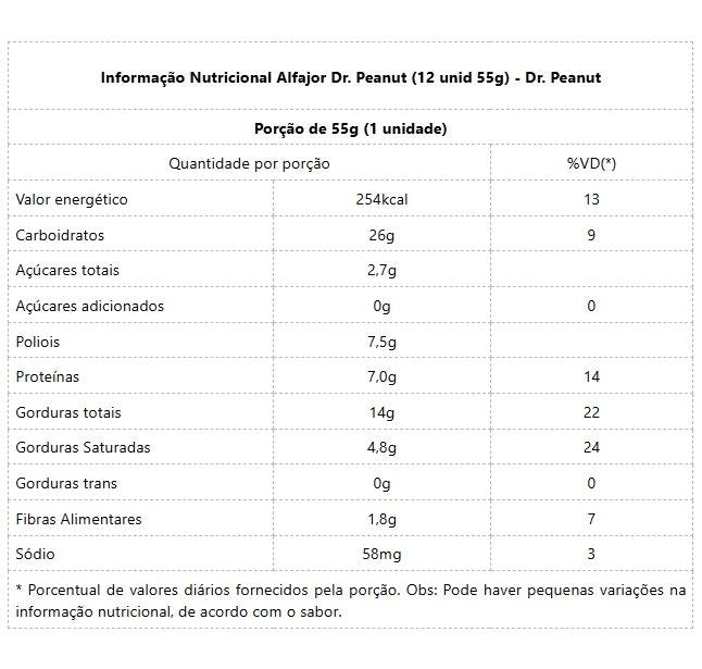 Alfajor Dr. Amendoim (Expositor 12 unid. 55g) O Lanche Ideal para sua Rotina Saudável!! Apresentamos a você o irresistível Alfajor Dr. Peanut Zero Açúcar Recheado com Pasta de Amendoim, uma verdadeira tentação em forma de doce! Com uma combinação perfeita entre o sabor suave do alfajor e a cremosidade da massa de amendoim, este produto vai conquistar seu paladar e deixar você com água na boca. Além do sabor incrível, o Alfajor Dr. Peanut é feito com ingredientes cuidadosamente selecionados, garantindo qualidade e frescor em cada mordida. Sem adição de conservantes artificiais, você pode desfrutar desse doce com tranquilidade, sabendo que está consumindo um produto de alta qualidade. Experimente essa delícia e deixe-se levar pelo sabor envolvente e irresistível!! Benefícios: - Zero Adição de Açúcar;- Com Whey Protein;- Crocante e Recheado com Dr. Amendoim;- Sacia a Vontade de Comer Doce;- Opção de Lanche Prático;- Muito Saboroso.