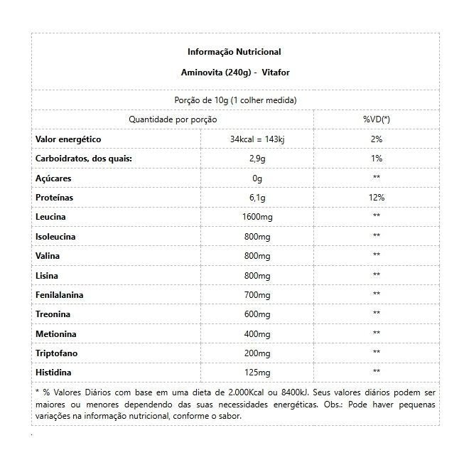 Aminovita (240g) - Vitafor AMINOVITA é um suplemento alimentar composto por 9 aminoácidos de origem vegetal: Leucina, Valina, Isoleucina, Lisina, Fenilalanina, Treonina, Metionina, Triptofano e Histidina, com zero adição de açúcares. Os aminoácidos auxiliam na recuperação dos estoques de energia, auxiliam na recuperação muscular e ganho de massa magra. Logo após a prática de atividade física, os músculos precisam de nutrientes para se recuperar e preparar para uma nova sessão de treino. Benefícios:* Aminoácidos de origem vegetal;* Aumenta a imunidade de praticantes de atividades físicas;* Preserva o tecido muscular;* Reduz a fadiga muscular durante treinos intensos;* Melhora a percepção da dor muscular pós-treino;* Auxilia na recuperação muscular após exercícios intensos;* Rápida Absorção;* Vegano;* 6g de aminoácidos por porção;* Baixo em valor energético (baixa caloria);* Não contém açúcar e glúten.