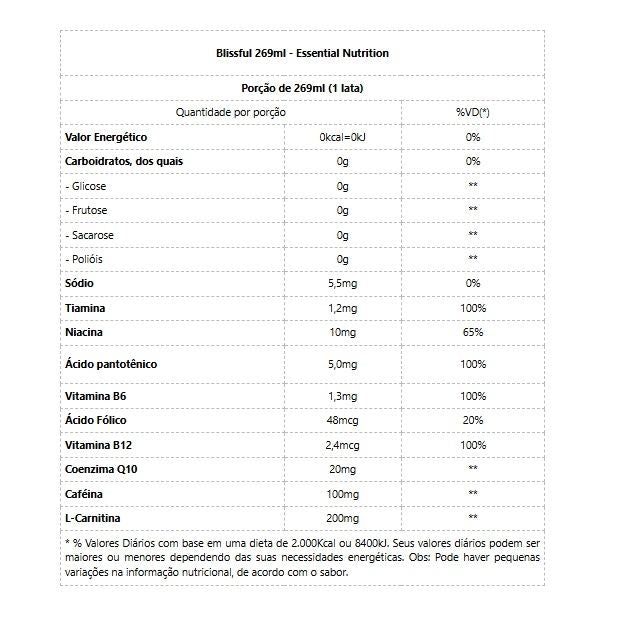 Blissful (269ml) - Essential Nutrition      Blissful é uma bebida inteligente com zero calorias e uma tecnologia que permite a combinação de ingredientes incríveis! Ideal para quem quer manter uma dieta saudável que potencializa a perda de peso, além de dar um UP no foco e concentração. Seu sabor de framboesa com um toque de limão e rosas torna Blissful uma bebida funcional saborosa e irresistível.     Sua fórmula contém Coenzima Q10 com maior biodisponibilidade, potencializada em até 5 vezes sua absorção. Contém também chá verde, l-carnitina e cafeína natural do guaraná, que atuam em sinergia para auxiliar o metabolismo energético, aumentar o estado de alerta e melhorar a concentração. Benefícios: - 20mg Coenzima Q10 (mais energia) 5X mais biodisponível;- 200mg de L-CARNITINA (auxilia no emagrecimento);- 100mg de cafeína natural do guaraná (mais foco e concentração);- Vitaminas essenciais do Complexo B (manutenção da pele e cabelos);- Zero açúcar e zero caloria;- Pode ser utilizado como prolongamento do jejum;- Pode ser consumida em qualquer momento do dia.