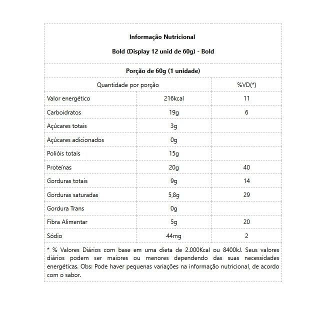 Bold (Display 12 unid de 60g)       A Bold oferece barrinhas de proteína com um sabor irresistível, ideais para pequenas refeições ao longo do dia e para auxiliar na regulação do apetite. Elas proporcionam níveis sustentados de energia, abastecem o corpo com nutrientes de alta qualidade e promovem o desenvolvimento muscular. Com 20g de proteína, a Bold é uma opção saudável e saborosa, com uma composição balanceada de fibras, gorduras e carboidratos.      Perfeita para todos os momentos vai muito bem como aquele lanche feito entre as principais refeições como pré e pós-treino ou, até mesmo como uma sobremesa extremamente saborosa e que não compromete a rotina alimentar. Experimente!   Benefícios: - 20g de proteínas;- Zero adição de açúcares;- 5g de Fibras;- Perfil equilibrado de gorduras e carboidratos;- Baixa quantidade de sódio;- Saborosa, prática e fácil de consumir.