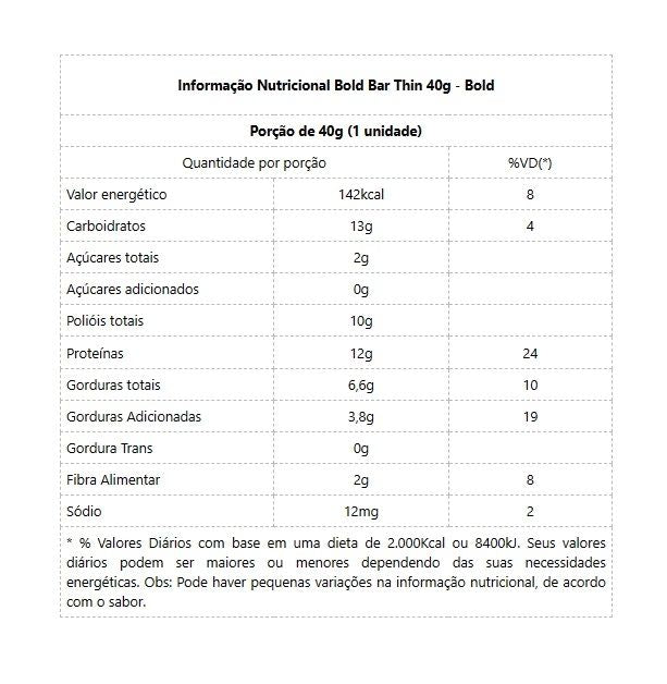 Bold Bar Thin 40g       A BOLD já era tão surreal e agora lançou um produto diferente que tá dando o que falar a BOLD THIN, por quê? Nós não temos limites quando o assunto é mostrar possibilidades incríveis para você se nutrir de forma saudável e saborosa. Ainda mais quando chegamos à conclusão que não temos concorrentes que ofereçam um produto realmente saudável.     A BOLD Thin não tem esse nome à toa. Ela possui 40g, enquanto a BOLD tradicional possui 60g.  Essa mudança que parece um detalhe, mas muda diversos pontos, um deles é se adequar melhor a quem prefere lanches menores. Com a BOLD Thin, você terá a experiência parecida de saborear uma barra de chocolate. A leveza provoca mudanças na forma como você saboreia sua BOLD. Já a tradicional, proporciona outra experiência, mas em um formato mais parecido com as barras proteicas.   Benefícios: - 12g de proteínas;- Zero adição de açúcares;- Rico em fibras;- Saborosa;- Praticidade no dia a dia.
