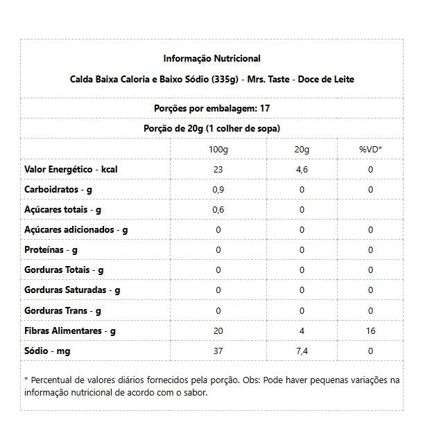 CALDA SABORES (335g) - MRS TASTE A combinação mais querida do momento com muito baixo teor de sódio e sem adição de açúcares, e mesmo assim com muito sabor. Isso tudo ainda é pouco, pois nossa calda é FONTE DE FIBRAS, o que ainda traz muitos benefícios, incluindo o auxílio no bom funcionamento intestinal, a sensação de saciedade, além do auxílio no controle de glicemia e colesterol. BENEFÍCIOS: * Fonte de Fibras;* Baixo em Calorias;* Muito baixo em Sódio;* Zero adição de Açúcares.