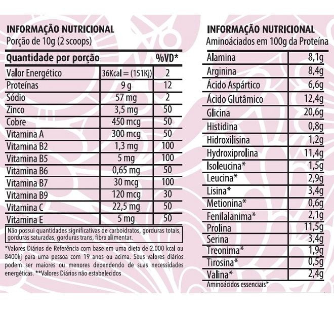 COLÁGENO HIDROLISADO BEAUTY COMPLEX (200g) - APISNUTRI O Colágeno Hidrolisado da Apisnutri possui vitaminas (A, C, E , Complexo B, Zinco e Cobre). Extraído da pele ou de ossos de animais devidamente inspecionados, em água de 50 a 60 °C ou utilizando-se enzimas. Trata-se de uma proteína natural derivada do colágeno nativo. A diferença em relação ao colágeno nativo é que estas proteínas são solúveis em água ou em salmoura e apresentam elevado conteúdo proteico (84 a 90%). BENEFÍCIOS * Manter as células dos tecidos unidas;* Responsável também pela cicatrização e/ou regeneração em caso de corte ou cirurgia;* Auxilia na hidratação do corpo e parece estar ligada ao processo do envelhecimento humano. Embalagem disponível: frasco contendo 200g. Sabor Neutro.