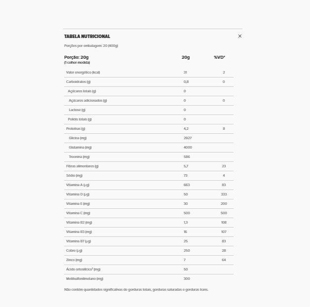 Collagen Gut - Essential Nutrition Collagen Gut é um mix ativo de ingredientes para quem busca dar atenção especial a um dos órgãos mais fascinantes do nosso corpo, o intestino. Ele possui uma combinação sinérgica de fibras, aminoácidos, peptídeos de colágeno, MSM, ácido ortosilícico, cúrcuma e outros ingredientes ativos com alta absorção, além de ser adoçado apenas com estévia - adoçante natural e Fodmap friendly. Alguns nutrientes têm o poder de auxiliar no funcionamento do sistema imune. Desde o nível de stress até aquilo que comemos, tudo se reflete no nosso intestino e tem consequências diretas na imunidade. O intestino é conhecido como nosso segundo cérebro por possuir milhões de células do sistema nervoso. O sistema nervoso entérico (SNE) presente em todo o intestino é capaz de direcionar mensagens diretamente para o cérebro, bem como controlar a liberação de diversas substâncias. Benefícios:* Auxilia no fortalecimento de unhas;* Manutenção de ossos;* Auxilia no fortalecimento da imunidade;* Estimula a elasticidade e hidratação da pele;* Mais tônus e firmeza para pele.