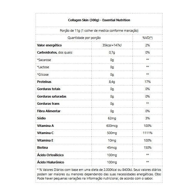 COLLAGEN SKIN - ESSENTIAL NUTRITION Collagen Skin foi desenvolvido e aprimorado para promover a máxima absorção do colágeno e nutrição da pele, para que você veja e sinta essa diferença. À medida que envelhecemos, o corpo passa a produzir menos colágeno. As consequências disso, bem como a falta das vitaminas A, C e E, ficam evidenciadas na pele, cabelos e unhas. Com a suplementação adequada é possível cuidar e amenizar estes efeitos. Além disso, Collagen Skin - Essential Nutrition possui selo de autenticidade VERISOL®, o único colágeno específico para a pele com comprovação cientifica de resultados. - NEW FORMULA. NEW SKIN.Em sua nova fórmula, é adicionado elementos que, quando estão juntos, se completam em perfeita harmonia. São 100mg de ácido hialurônico, combinado aos peptídeos de colágeno hidrolisado, ao ácido ortosilícico e a uma seleção de vitaminas fundamentais para a nutrição da pele, cabelos e unhas, desempenhando um papel relevante na nutrição do corpo. - O QUE SÃO PEPTÍDEOSDE COLÁGENO?Peptídeos de colágeno são o resultado de um passo a mais no processo de obtenção do colágeno. Primeiro, o colágeno in natura passa pelo processo de hidrólise, que reduz o seu tamanho, resultando no colágeno hidrolisado. Já hidrolisado, o colágeno é submetido a mais uma etapa que padroniza seu tamanho molecular em peptídeos. Por serem minúsculos, os peptídeos de colágeno hidrolisado estão prontos para serem absorvidos e agirem de forma mais rápida e eficaz. - QUAL A MELHOR HORA DE CONSUMIR COLLAGEN SKIN?Collagen Skin tem sua absorção favorecida quando consumido longe de refeições proteicas. Isso significa que um bom momento pode ser antes de dormir, quando nosso corpo vai repousar e pode absorver os nutrientes de maneira mais tranquila e eficiente, ou em jejum pela manhã. Se você é adepto do limão espremido ao acordar, essa pode ser uma boa combinação com Collagen Skin. BENEFÍCIOS: - Máxima nutrição da pele;- Peptídeos bioativos de colágeno;- Ácido ortosilícico biodisponível de alto poder de absorção;- Vitaminas A, C e E;- Sem adoçantes artificiais;- Sem açúcar;- Sem glúten;- Sem lactose;- Sem conservantes;- Livre de gorduras e colesterol.
