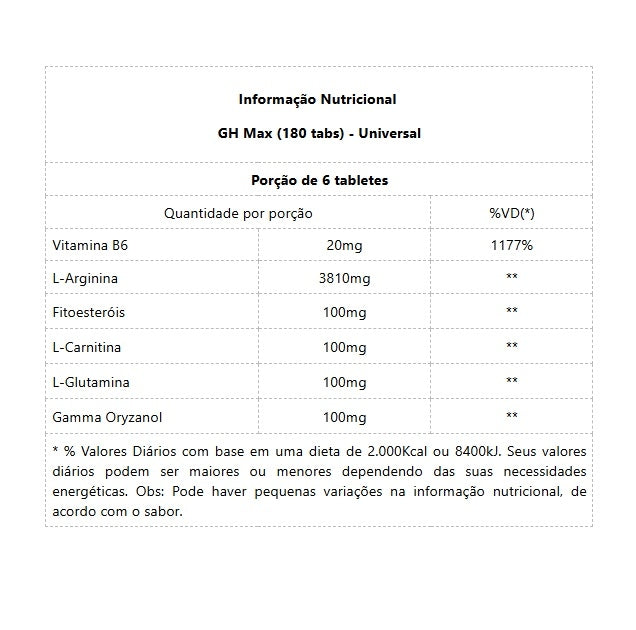 GH Max (180 tabs) Universal Nutrition GH Max é uma fórmula anabólica, potência máxima e resultados máximos. O GH Max da Universal Nutrition é a fórmula definitiva de liberação de GH para fisiculturistas sérios ou powerlifters que estão interessados em ganhos extremos de tamanho e força. O hormônio do crescimento (GH) tem a capacidade de aumentar a massa magra, estimulando a síntese de proteínas e aumentando a retenção de nitrogênio nos músculos. Estudos mostraram que o GH também ajuda a transportar aminoácidos essenciais específicos para as células musculares, além de ter um efeito semelhante à insulina. Projetado com os liberadores mais poderosos disponíveis, além de nutrientes anabolizantes extras, a força máxima do GH Max oferece a você a vantagem absoluta. Apenas esta fórmula revolucionária contém a proporção de 2: 1 cientificamente comprovada de l-arginina para l-ornitina. O GH Max também adicionou o poder do gama-orizanol, boro (a partir de um complexo Tri-boro especial), vitamina B6 fundidos numa base de substratos anabólicos à base de plantas. Cada tablet GH Max incorpora uma tecnologia avançada de liberação sustentada (Unisync) para garantir a liberação correta de GH Max em sua corrente sanguínea. Mire os períodos de pico de liberação de GH do seu corpo (durante os treinos e o sono) com o GH Max hoje. A Universal Nutrition tem sido um dos principais fabricantes de suplementos nutricionais esportivos desde 1977. Nossa missão é fornecer fórmulas de nutrição esportiva e saúde de alta qualidade a preços competitivos. Na Universal Nutrition, queremos ser parceiros em seus esforços para alcançar seu potencial e alcançar um físico mais forte. Acima de tudo, valorizamos qualidade, atendimento, capacidade de resposta, confiabilidade e inovação. Benefícios: - Eficaz no aumento da secreção de GH;- Desenvolve o músculo e a força;- Promove o aumento da síntese de proteínas;- Seguro, Eficaz;- Farmacologicamente testado;- Produzido pela Universal, EUA.