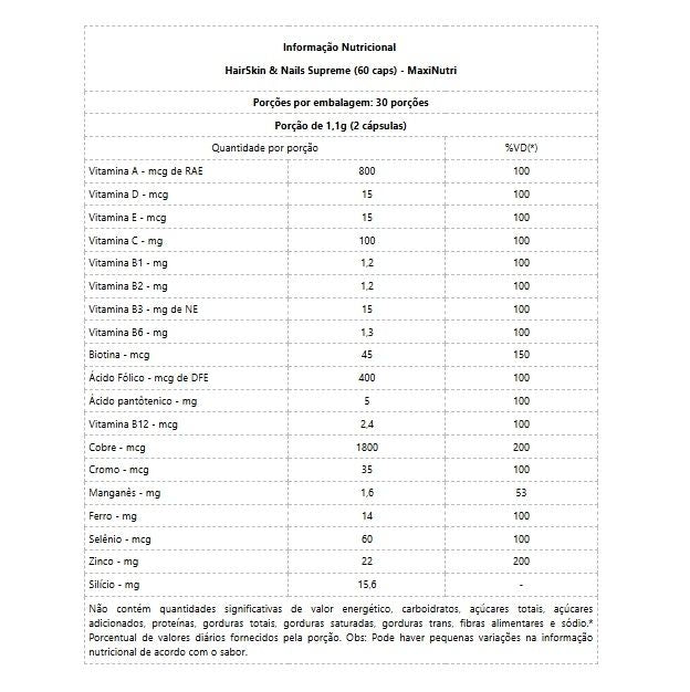 HairSkin e Nails Supreme (60 caps) O HairSkin e Nails Supreme é um produto natural para o tratamento e fortalecimento dos cabelos, pele e unhas, rico em vitaminas e minerais, ele se torna um produto indispensável para quem sente muita dificuldade com o tratamento áreas de ressecamento do cabelo, cabelos quebradiços, unhas quebradiças, pele seca e com falta de hidratação, entre outros. Sua fórmula é rica em D-Pantenol, considerada a precursora do ácido pantotênico. Em contato com os cabelos, o D-Pantenol age em benefício dos fios, trazendo vitalidade e beleza aos cabelos. A substância dessa vitamina promove a hidratação de longo prazo dos fios e melhora a textura e maleabilidade, diminuindo a criação de pontas duplas e melhorando a condição dos cabelos agredidos. HairSkin e Nails Supreme possui também Vitamina C, que além de um excelente antioxidante, também auxilia na formação de colágeno. E Cobre que contribui para a pigmentação dos cabelos. Benefícios: ** A VITAMINA C É UM ANTIOXIDANTE E AUXILIA NA FORMAÇÃO DO COLÁGENO;** O COBRE CONTRIBUI PARA A PIGMENTAÇÃO DO CABELO;** FORTALECIMENTO DOS CABELOS;** REDUZ A QUEDA DOS CABELOS;** HIDRATAÇÃO E FIRMEZA DA PELE.