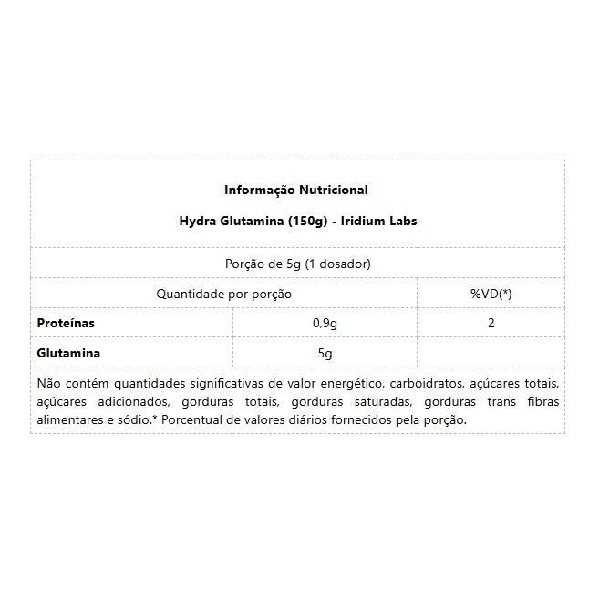 HYDRA GLUTAMINA (150g) - IRIDIUM LABS Em algumas situações específicas, como durante a prática de atividades físicas, o gasto da glutamina é muito maior do que a sua produção. Por isso, sua suplementação é essencial. Se você quer evitar o catabolismo (perda de massa magra) e estimular o anabolismo, se quer prevenir a queda de rendimento e melhorar a recuperação muscular, se quer garantir o bom funcionamento do sistema imunológico, prevenindo inflamações e infecções que podem atrapalhar seu treino e seus resultados, Hydra Glutamina é o suplemento ideal para você. BENEFÍCIOS: * Promove o aumento da força muscular;* Fortalece o sistema imunológico;* Possui efeito anabólico e anti-catabólico;* Auxilia na melhora do desempenho físico;* Melhora o nível de hidratação muscular; DIFERENCIAIS: * Hipertrofia: a glutamina é essencial para o processo de ganho de massa magra, pois é um aminoácido que possui papel importantíssimo na síntese de proteína;* Anti-catabólico: estudos mostram o efeito da suplementação de Glutamina na redução do catabolismo muscular, prevenindo a perda de músculos;* Melhora do desempenho: em exercícios de longa duração ocorre uma grande perda de Glutamina e sua suplementação garante uma melhora do rendimento e da resistência;* Matéria-prima de qualidade: a glutamina utilizada na composição de Hydra é produzida pela AminoScience, reconhecidamente uma das melhores que existe.
