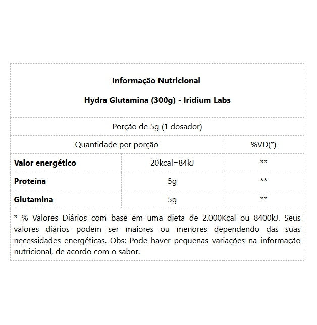 Hydra Glutamina (300g) - Iridium Labs Em algumas situações específicas, como durante a prática de atividades físicas, o gasto da glutamina é muito maior do que a sua produção. Por isso, sua suplementação é essencial. Se você quer evitar o catabolismo (perda de massa magra) e estimular o anabolismo, se quer prevenir a queda de rendimento e melhorar a recuperação muscular, se quer garantir o bom funcionamento do sistema imunológico, prevenindo inflamações e infecções que podem atrapalhar seu treino e seus resultados, Hydra Glutamina é o suplemento ideal para você. BENEFÍCIOS: * Promove o aumento da força muscular;* Fortalece o sistema imunológico;* Possui efeito anabólico e anti-catabólico;* Auxilia na melhora do desempenho físico;* Melhora o nível de hidratação muscular; DIFERENCIAIS: * Hipertrofia: a glutamina é essencial para o processo de ganho de massa magra, pois é um aminoácido que possui papel importantíssimo na síntese de proteína;* Anti-catabólico: estudos mostram o efeito da suplementação de Glutamina na redução do catabolismo muscular, prevenindo a perda de músculos;* Melhora do desempenho: em exercícios de longa duração ocorre uma grande perda de Glutamina e sua suplementação garante uma melhora do rendimento e da resistência;* Matéria-prima de qualidade: a glutamina utilizada na composição de Hydra é produzida pela AminoScience, reconhecidamente uma das melhores que existe.