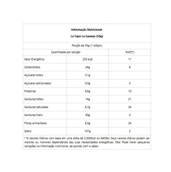 La Fajor La Ganexa (50g) O LA FAJOR é um alfajor fit que traz toda a qualidade La Ganexa que você já conhece: A La Ganexa é uma poderosa marca brasileira que teve um grande destaque no programa Shark Tank Brasil, lá eles lançaram as poderosas pastas de amendoim, com o sabor mais amado do Brasil, o leitinho. Hoje a marca é uma referência no mercado e é um grande sucesso de vendas, por isso resolveram expandir sua linha de produtos, desta forma lançaram o La fajor, o Alfajor proteico da La Ganexa. O La Fajor é um alfajor proteico muito saboroso feito com a mesma qualidade das poderosas pastas de amendoim La Ganexa, cada La Fajor conta com 9g de proteína, tem a adição de whey protein, além de zero glúten, e zero adição de açúcar. La Fajor o melhor doce fit que você já comeu!! Benefícios: - Zero adição de açúcar;- Com Whey Protein;- Zero Glúten;- Recheado com a deliciosa pasta de amendoim La Ganexa;- Cabe na bolsa.
