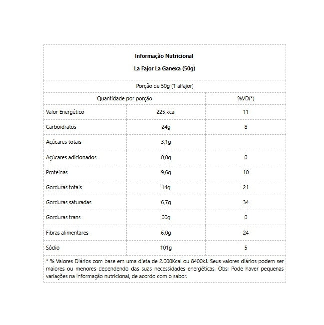 La Fajor La Ganexa (50g)       O LA FAJOR é um alfajor fit que traz toda a qualidade La Ganexa que você já conhece:      A La Ganexa é uma poderosa marca brasileira que teve um grande destaque no programa Shark Tank Brasil, lá eles lançaram as poderosas pastas de amendoim, com o sabor mais amado do Brasil, o leitinho. Hoje a marca é uma referência no mercado e é um grande sucesso de vendas, por isso resolveram expandir sua linha de produtos, desta forma lançaram o La fajor, o Alfajor proteico da La Ganexa.      O La Fajor é um alfajor proteico muito saboroso feito com a mesma qualidade das poderosas pastas de amendoim La Ganexa, cada La Fajor conta com 9g de proteína, tem a adição de whey protein, além de zero glúten, e zero adição de açúcar.        La Fajor o melhor doce fit que você já comeu!!   Benefícios: - Zero adição de açúcar;- Com Whey Protein;- Zero Glúten;- Recheado com a deliciosa pasta de amendoim La Ganexa;- Cabe na bolsa.