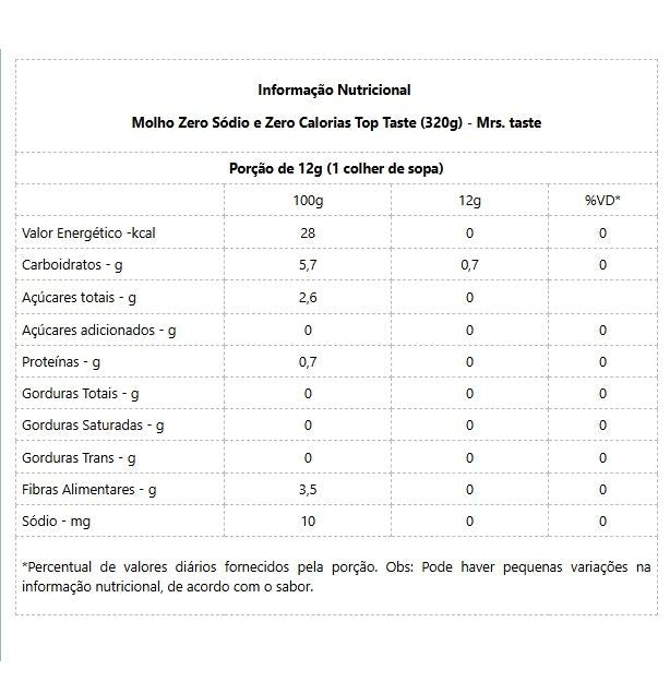 Molho Baixo Sódio e Baixa Caloria Top Taste (320g) O novo molho da Mrs Taste possui um sabor marcante, agridoce e enigmático para quem experimenta. Top Taste é uma mistura bem brasileira de tomate com goiaba, dois frutos altamente usados na cozinha brasileira, que combinam com diversos tipos de pratos, temos um molho que não foge das características da marca, é muito baixo em sódio, sem adição de açúcares e baixo em calorias! Todos os benefícios que você já conhece, com um sabor totalmente novo! Benefícios: - Baixo em calorias;- Zero adição de açúcares;- Muito baixo em sódio;- Saboroso.