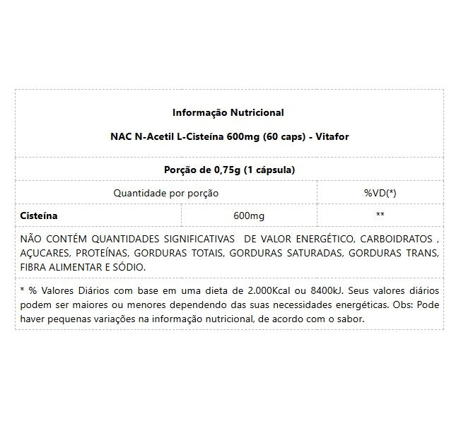 NAC N-Acetil L-Cisteína 600mg (60 caps) O N-Acetyl L-Cysteine da Vitafor é um Suplemento Alimentar de N-Acetyl L-Cysteine em Cápsulas. Com 600 mg por porção, pode beneficiar o metabolismo na construção muscular, força e sistema imunológico, além de auxiliar na absorção de nutriente. N-acetil-cisteína (NAC) é um precursor do aminoácido L-cisteína, sendo este crucial para a formação da glutationa, um dos antioxidantes mais importantes do corpo, que ajuda a neutralizar os radicais livres que podem danificar células e tecidos do corpo. Benefícios:- Potencializa e fortalece o sistema imunológico;- Aumenta e controle a síntese de proteínas;- Colabora nas funções de anabolismo muscular e previne o catabolismo;- Aumento da força;