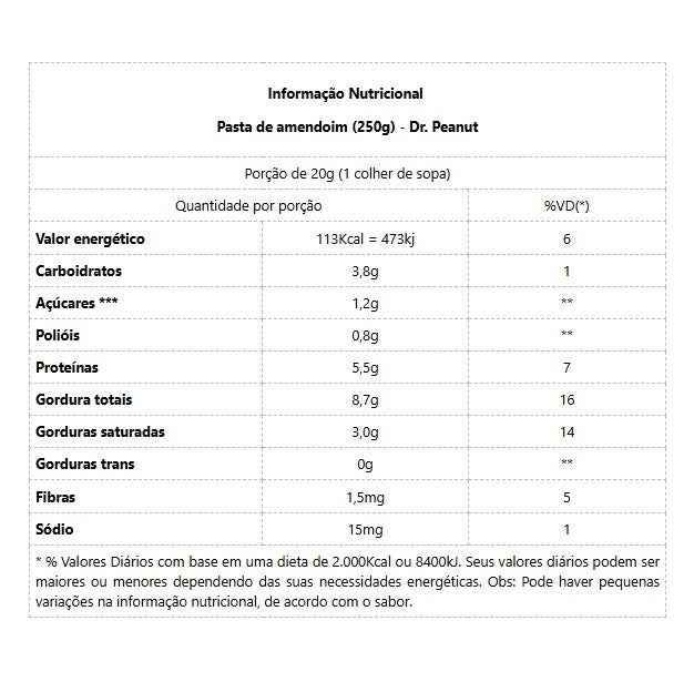 Pasta de Amendoim (250g) A Pasta de Amendoim da Dr. Peanut é a melhor maneira de consumir proteína em sua dieta de um jeito muito saboroso e mais saudável. A pasta de amendoim fornece energia de longa duração, é rica em gordura saudável e mantém a saciedade por mais tempo. Ela contém em sua formulação 25% de proteína ISOLADA, sendo 5g por porção! E ainda é adoçada com xilitol. A Pasta de Amendoim da Dr. Peanut é um alimento rico em gordura monoinsaturada, aquela gordura “boa”, e fitosteróis que ajudam no combate do colesterol. Além disso, é um antioxidante natural, de baixo carboidrato, integral, zero glúten, zero gordura trans e zero açúcar. Como ela é uma excelente fonte de gordura e proteínas, pode ser utilizada em dietas que visam a perda de peso ou ganho de massa muscular. Além de todos esses benefícios, a Pasta de Amendoim Dr. Peanut é adoçada com xilitol e feita com ingredientes de alta qualidade, garantindo um sabor incrível! Pode comer na tapioca, no shake, com fruta e até de colher! Benefícios: * Apresenta 25% de proteína por porção;* Com Whey protein isolado;* Baixo carboidrato e sódio;* Contém Colágeno hidrolisado;* Fonte de Ômega 3 e 6;* Zero glúten e gordura trans;* Adoçado com xilitol natural;