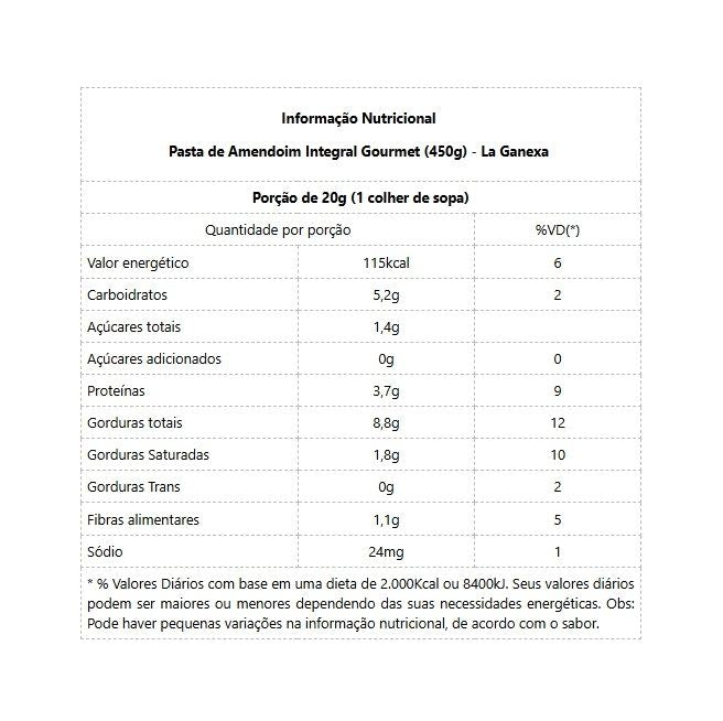 Pasta de Amendoim Integral Gourmet (450g) Você é apaixonado(a) por pastas de amendoim?Nós da La Ganexa também somos! Chegamos com a proposta de oferecer as melhores pastas de amendoim, proporcionando satisfação incomparável, preservando a sua saúde.Prepare-se para se deliciar com uma experiência única e saudável! Feita com ingredientes selecionados e processada com o máximo cuidado, nossa pasta de amendoim é o acompanhamento perfeito para o seu estilo de vida saudável e saboroso.Experimente a Pasta de Amendoim Integral Gourmet e descubra um mundo de sabor e saúde em cada colherada! Benefícios: - Ingredientes Naturais e Integrais;- Zero açúcar, Zero Glúten;- Fonte Natural de Proteínas;- Qualidade e Sabor Garantido.
