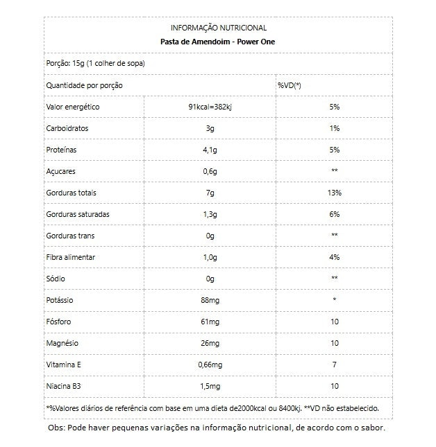 Pasta de Amendoim Sabores Naturais (1,005kg) A Pasta de Amendoim Power One é 100% natural e integral, não possui açúcar, sódio, gordura trans, lactose e glúten. Ideal para dietas restritivas ou para quem quer comer algo saboroso sem culpa; possui baixo carboidrato e é rica em proteína, Ômega-3, Ômega-6, Selênio e Vitamina E. Pasta de amendoim granulada Power One sem adição de açúcar, ideal para incluir em dietas, receitas de sua preferência ou até mesmo consumir no café da manhã, pode ser utilizada em seu shake de proteína também! Disponibiliza uma boa quantia de gorduras boas, fonte de proteína, fonte de vitaminas e minerais. Disponível também na versão Cremosa e com açúcar de coco. BENEFÍCIOS: - Vegano; - Zero Açúcares* - Zero Lactose; - Zero Sódio; - Não Contém Glúten; - Grãos selecionados.