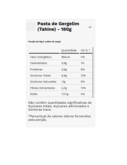 Pasta de Gergelim (180g) A Pasta de Gergelin Eat Clean é a escolha ideal para quem busca um alimento nutritivo, saboroso e sem ingredientes desnecessários. O gergelim é uma excelente fonte de nutrientes essenciais para o funcionamento do organismo. Entre eles o ômega 3 e 6, ferro, cálcio, cobre, zinco, e vitaminas do complexo B. Tem benefícios associados à saúde cardiovascular, saúde óssea e também na pele devido à ação antioxidante. Seja para dar mais energia ao seu dia, complementar sua dieta ou simplesmente aproveitar um sabor incrível, a Pasta de Gergelin Eat Clean é a escolha certa. Experimente agora e sinta a diferença! Benefícios: - Sem aditivos artificiais, conservantes ou açúcares refinados.- Rica em Proteínas – Excelente opção para quem deseja aumentar a ingestão proteica.- Fonte de Gorduras Boas – Auxilia na saciedade e fornece energia duradoura.- Versatilidade na Alimentação – Pode ser consumida pura, com frutas, em receitas ou shakes.