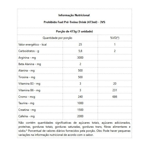 Prohibido Fuel Pré-Treino Drink (473ml) A FÓRMULA DO PROHIBIDO FUEL FOI DESENVOLVIDA PARA IMPULSIONAR SUA QUALIDADE DE VIDA. Seu corpo é uma máquina incrível que, para funcionar em seu melhor, precisa dos nutrientes certos em combinações eficazes. É exatamente essa sinergia perfeita de ingredientes que o Prohibido Fuel oferece ao seu organismo. O Prohibido Fuel contém ingredientes poderosos como I- arginina, beta-alanina, I-tirosina, vitaminas b3 e b6, cromo, I- taurina e creatina. Benefícios: - 2.000mg de Beta Alanina;- 3.000mg de Arginina;- 1.000mg de Taurina;- 500mg de Alanina;- 200mg de Cafeína;- Creatina e Palatinose;- Fonte de vitaminas;- Sabores incrivelmente prazerosos em beber;- Melhora o foco e o tempo de velocidade de resposta;- Acelera o metabolismo e aumenta a energia;- Prático em transportar independente do dia-a-dia, de treino e exercícios.