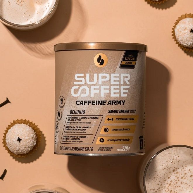 SuperCoffee 3.0 (220g) SuperCoffee 3.O é uma bebida com 20 ingredientes estrategicamente combinados ao café e foi cuidadosamente pensado para proporcionar uma energia potente, natural e que não oscila, com benefícios que otimizam ainda mais a sua rotina.O SuperCoffee Língua de Gato é uma edição especial, resultado da parceria entre a Caffeine Army e a Kopenhagen, que traz o sabor clássico do chocolate Língua de Gato com os benefícios funcionais do SuperCoffee. Além de delicioso, ele é rico em nutrientes que promovem energia limpa e duradoura, ideal para quem busca manter o foco e a disposição ao longo do dia. PRA QUEM Este produto foi desenvolvido para quem busca melhorar a performance física e mental. Quem busca disposição, mais resistência física e a capacidade de concentração contínua. COMPLEXOS ATIVOS Café Arábica + Taurina + Coenzima Q10 + TCM e C10 = energia limpa e sem oscilação;Complexo B + Colina + Cromo + Cafeína Microencapsulada = foco e performance cognitiva;Colágeno Verisol + L-Tirosina + Café Verde + L-Carnitina = matabolismo e saúde da pele. CAFFEINE ARMY Somos um movimento com a missão de oferecer energia e incentivar as pessoas a viverem as suas melhores versões. Desenvolvemos suplementos inteligentes, com ingredientes de alto valor nutricional e à base de café, para performance física e mental. Temos três pilares que sustentam nossa constante evolução: ciência, tecnologia e qualidade. Caffeine Army é Smart Energy, energia que não oscila e não te deixa na mão. BENEFÍCIOS: - Performance e energia;- Concentração e foco;- Disposição sem excitação;- Saúde da pele, unhas e cabelos;- 2,5g de Colágeno Verisol na porção diária;- 100mg de Coenzima-Q10, por dosador;- 525mg Tirosina, por dosador;- 500mg Café Verde, por dosador.