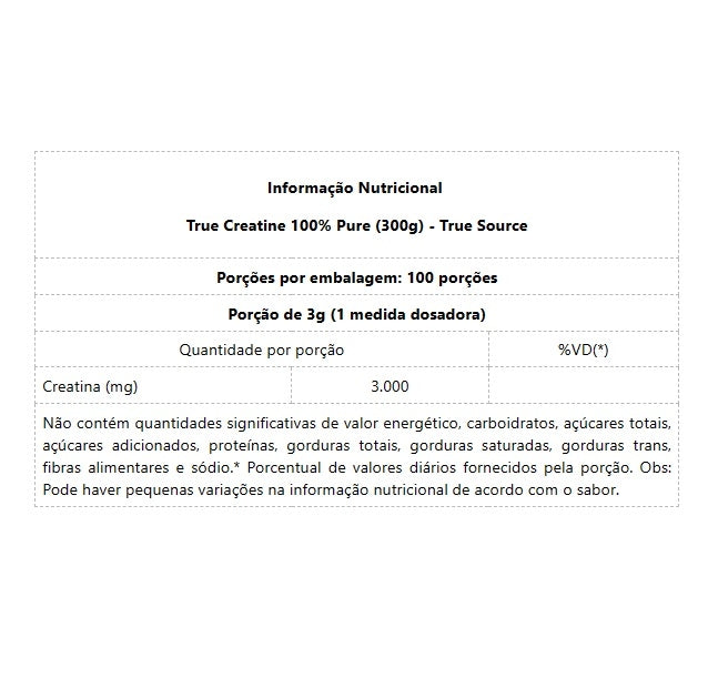 True Creatine 100% Pure (300g) Agora nós temos em nosso time a True Creatine. O uso desse suplemento vastamente estudado, vai muito além de aumentar a força, volume muscular e rendimento nos treinos. A Creatina, não tem nenhum produto animal. Ela é produzida a partir de uma tecnologia exclusiva por meio de síntese química. A True Creatine é para quem quer o melhor! Benefícios: - 3g de creatina por porção;- 100% Pura;- Hipoalergênica;- Sem adoçantes, glúten e corante;- Força muscular, volume e energia;- Melhora a cognição;- Melhora a hidratação do corpo;- Suporte na recuperação muscular.