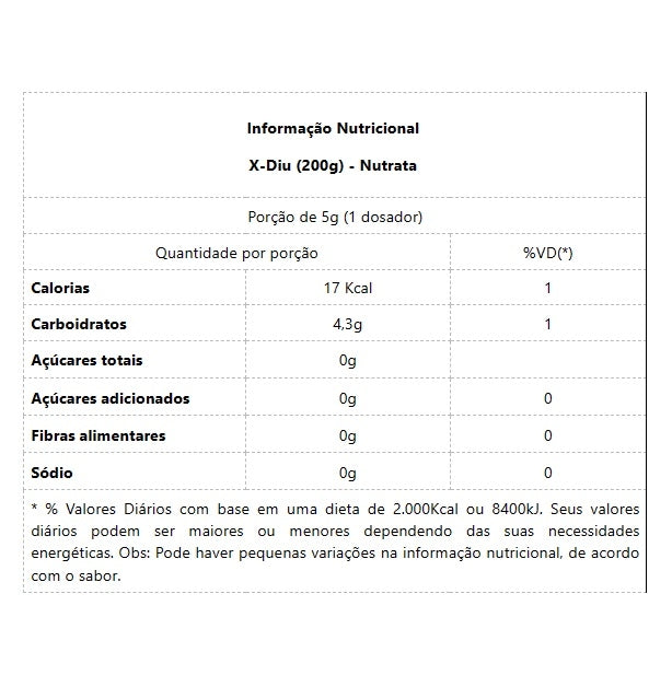 X-Diu (200g) X-Diu é um suplemento natural à base de hibisco, chá verde e carqueja, sem adição de açúcares, corantes ou aditivos. A combinação dos ativos presentes nos ingredientes do X-Diu otimiza a eliminação de toxinas do organismo. X-Diu possui uma fórmula exclusiva com ingredientes selecionados pelos seus benefícios. Confira logo abaixo os benefícios dos seus compostos ativos: Benefícios: CHÁ VERDE – A Camellia sinensis tem sido amplamente investigada devido ao seu conteúdo específico de flavonóides, que lhe confere inúmeros atributos terapêuticos. A propriedade antioxidante das catequinas do chá verde tem sido apontada como o principal fator contribuinte na abordagem de algumas patologias;HIBISCO – Tradicionalmente utilizado como diurético, possui propriedades antioxidantes e possui um valor representativo de antocianinas, vitamina C e polifenóis, é utilizado como planta medicinal e alimento funcional em diferentes países;CARQUEJA – Estudos relatam que a principal indicação terapêutica mencionada está relacionada com ações sobre o trato gastrintestinal e propriedades hepatoprotetoras;UVA, LIMÃO, CÚRCUMA, PIMENTA PRETA, ALECRIM, HORTELÃ – Mix especial de ingredientes com compostos fenólicos, excelentes antioxidantes e anti-inflamatórios.